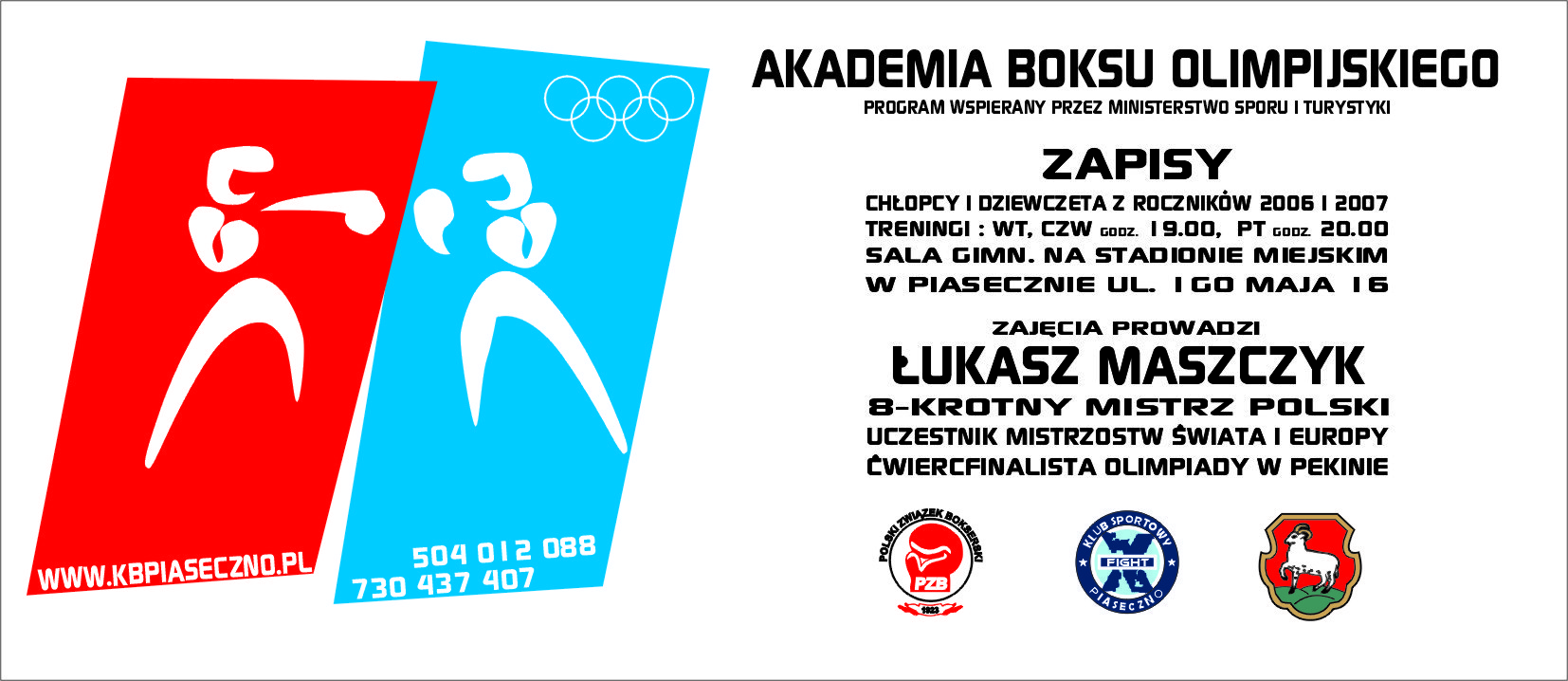 Dodano wtorek, 4 września 2018Klub Sportowy X Fight uczestniczy w programie szkoleniowym Polskiego Związku Bokserskiego " AKADEMIA BOKSU OLIMPIJSKIEGO" dedykowanym młodym ludziom, którzy dopiero zaczynają swoją przygodę z Boksem. Zapraszamy na bezpłatne treningi chłopców i dziewczęta z roczników 2006 i 2007. Zajęcia odbywac się będą w sali gimnastycznej na terenie Stadionu Miejskiego przy ul. 1go Maja 16. Uczestników szkolic będzie nasz doświadczony trener, 8-krotny Mistrz Polski, reprezentant Polsi na Olimpiadzie w Pekinie ŁUKASZ MASZCZYK. Program treningowy zawierac będzie: