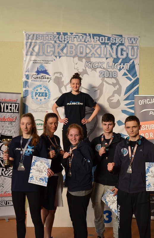 Dodano wtorek, 6 marca 2018W dniach 9-11.03.2018 dbyły się w Kartuzach Mistrzostwa Polski Seniorów i Juniorów w Kickboxingu w formule Kick Light. Nasza ekipa przywiozła ze stolicy Kaszub 6 medali. Wśród juniorów najlepiej spisała sie Agata Kacprzak (kat.-55kg), która w swojej kategorii wagowej dotarła do finału, gdzie po bardzo wyrównanej walce uległa utytułowanej Wiktorii Kolczyk. Bardzo dobrze walczył również Rafał Wójcik (kat. -63kg) który minimalnie w półfinale uległ Adrianowi Smolińskiemu z Dragona Toruń. W tej samej kategorii mogliśmy zobaczyc również Jakuba Lipskiego który przez kontuzję musiał zakończyc swoją rywalizację na 3 stopniu podium. . Seniorzy przywieźli z tych zawodów 3 tytuły v-ce Mistrzów Polski. Po srebrne medale sięgneli: Marcin Nasiadko (kat.-57kg), Joanna Różańska (kat.-60kg) i Paulina Batorzyńska (kat.-70kg). Nasi zawodnicy zaprezentowali bardzo dobre przygotowanie techniczne. Zabrakło odrobiny szczęścia i kondycji. W klasyfikacji medalowej zajęliśmy 3 miejsce :)