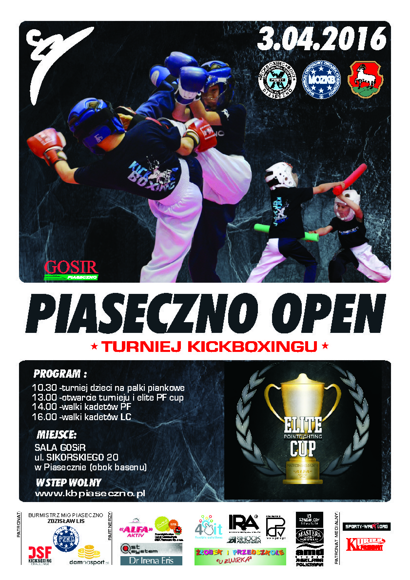 Dodano poniedziałek, 21 marca 2016W niedzielę 4 kwietnia odbył się IV coroczny turniej kickboxingu Piaseczno Open. Na hali GoSiR w Piasecznie stawiło się blisko 250ciu zawodników w 13 klubów z całej Polski. Najmłodsi rywalizowali w formie zabawy na pałki piankowe zarówno w konkurencjach indywidualnych jak i drużynowo. W grupie wiekowej kadetów rozegrano dwie konkurencje: Pointfighting i Ligh contact. Wśród startującyh było wielu aktualnych Mistrzów Polski i medalistów turniejów miedzynarodowych co gwarantowało zmagania na najwyższym poziomie. Wśród dzieci najlepiej spisali się: Sebastian Korda, Sebastian Sas, Maciej Mika, Hubert Wiluk, Tomasz Bednarczyk, Martyna Wieteska i Daria Niciporuk a także drużyna dzieci młodszych (Cezary Kozłowski, Sebastian Korda i Natalia Frołow) nie dając szans swoim przeciwnikom w swoich kategoriach wzrostowych. W rywalizacji kadetów na wyróżnienie zasługują: Mikołaj Dąbrowski, Natalia Woińska i Mateusz Śliwiński, którzy zostali wybrani najlepszymi zawodnikami turnieju. Ozdobą turnieju była rywalizacji Seniorów bez podziału na kategorie wagowe w ramach cyklu Pointfighting Elite cup. Najlepszym z najlepszych wśród mężczyzn został Bartosz Baczyński a wśród kobiet tryumfowała Dorota Godzina. Oboje są zawodnikami i szkoleniowcami w klubie X Fight w Piasecznie. Chcielibyśmy podziękowac sponsorom i patronom turnieju ( burmistrz MiG Piaseczno -Zdzisław Lis, GOSiR Pno, DSF, Dam na sport, Alfa Active, IRA, 4it, PDV, Sita, AMD Studio, U Żwirka, st System, Dr Irena Eris, Sport Masters, Szock Absorber, Szacun.com) Bez nich nie udałoby się zorganizowac tak świetnej imprezy. Poniżej prezentujemy pełne wyniki turnieju.