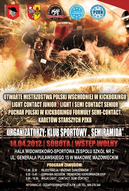 Dodano środa, 11 kwietnia 201214.04.2012 w Makowie Mazowieckim odbyły się Mistrzostwa Polski Wschodniej w Kickboxingu – semi i light contact seniorów oraz light contact juniorów. Ponadto został rozegrany Puchar Polski Kickboxing semi contact kadetów starszych.