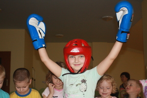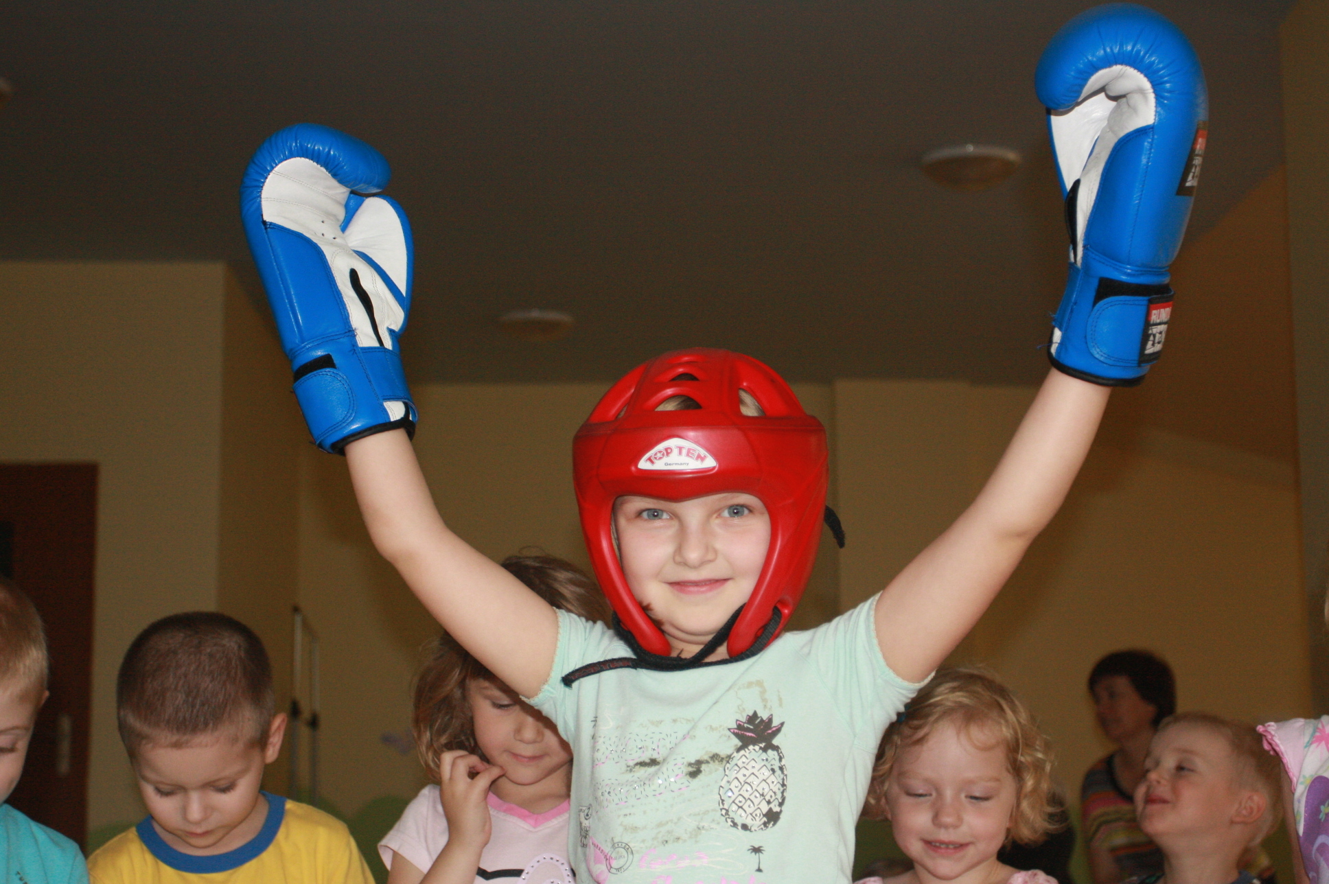 Klejną atrakcją dla dzieci było przymierzanie sprzętu sportowego używanego podczas walki sportowej.