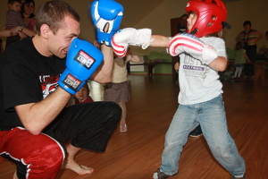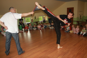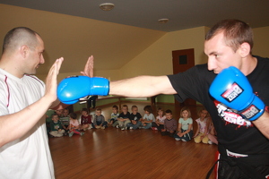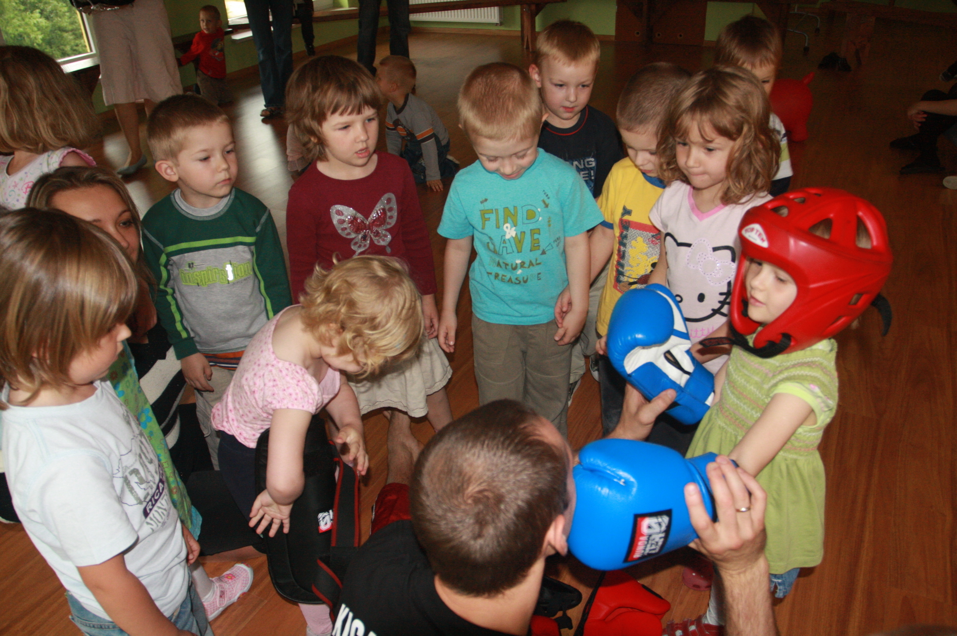 Spotkanie przebiegało w bardzo miłej atmosferze gier i zabaw, w których brały udział przedszkolaki. Do jedną z atrakcji był pokaz technik stosowanych w kick-boxingu w walce sportowe, przez samego mistrza.